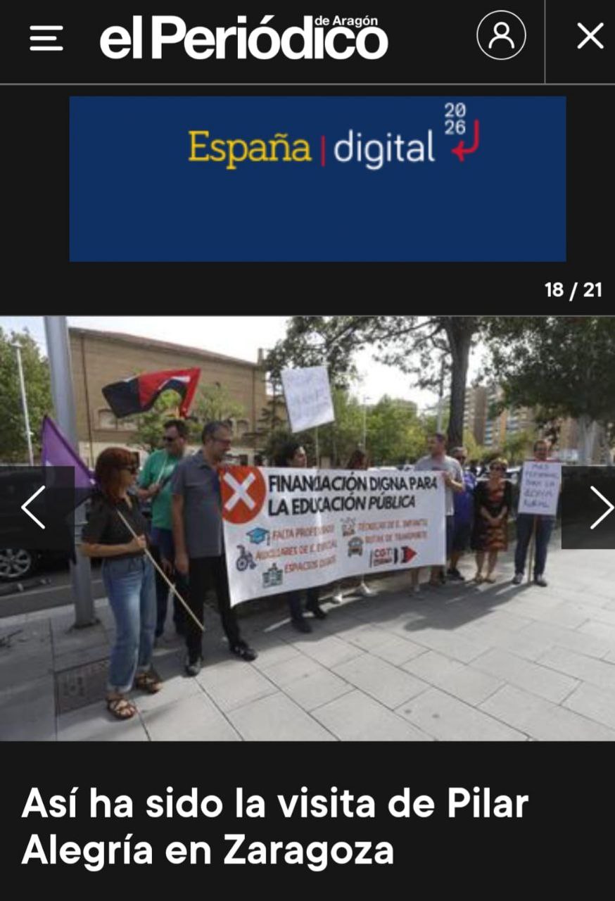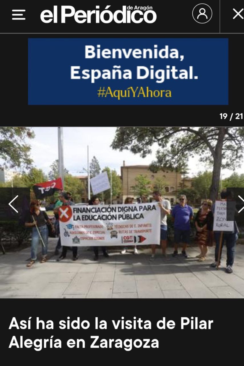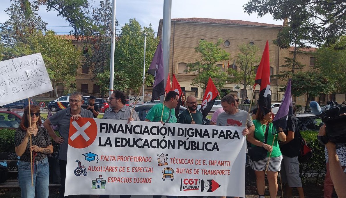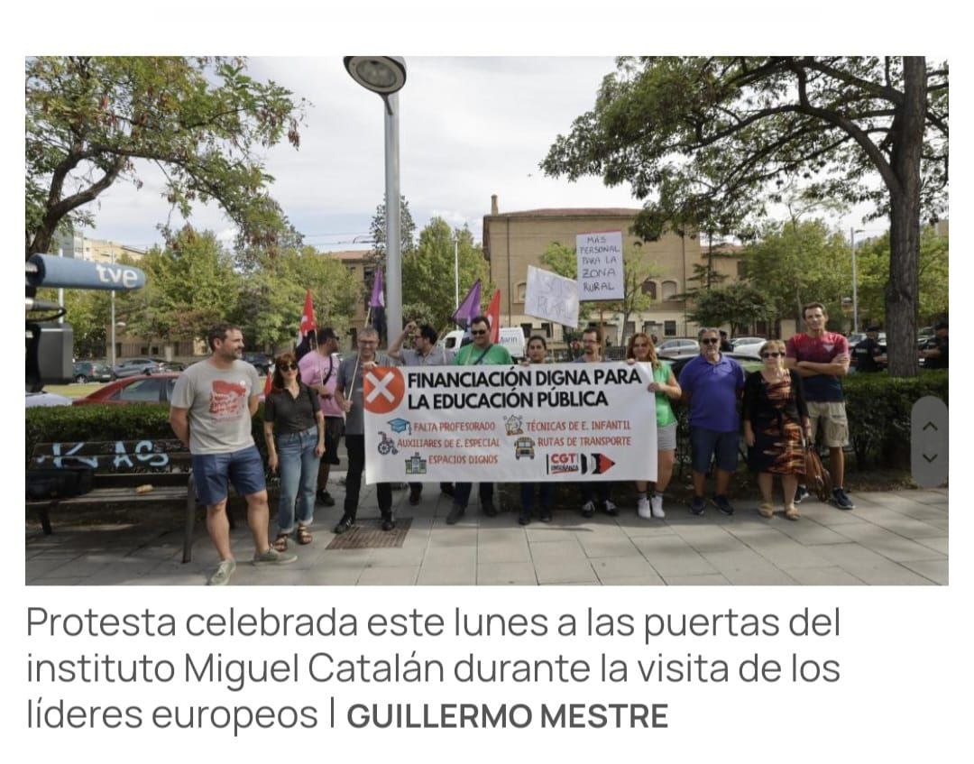 Ayer, 18 de septiembre, alrededor de 100 personas se concentraron frente al IES Miguel Catalán, para exigir a la Consejera de Educación del Gobierno de Aragón, Claudia Pérez, y a la Ministra de Educación, Pilar Alegría, una financiación digna para la enseñanza pública, al tiempo que se ha protestado por el caótico inicio de curso.