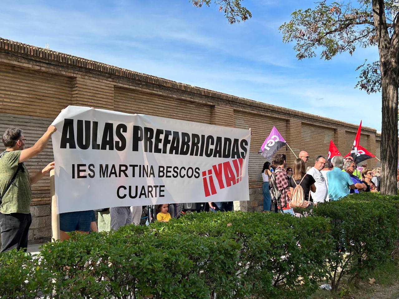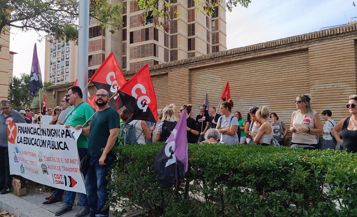 En la concentración han estado auxiliares de educación especial y técnicas de educación infantil, colectivos maltratados este inicio de curso por los problemas que está habiendo con su contratación, así como miembros de la comunidad educativa del IES Martina Bescós de Cuarte, el cual ha sido obligado a abrir sus puertas sin tener espacios para acoger a su alumnado del bachillerato.