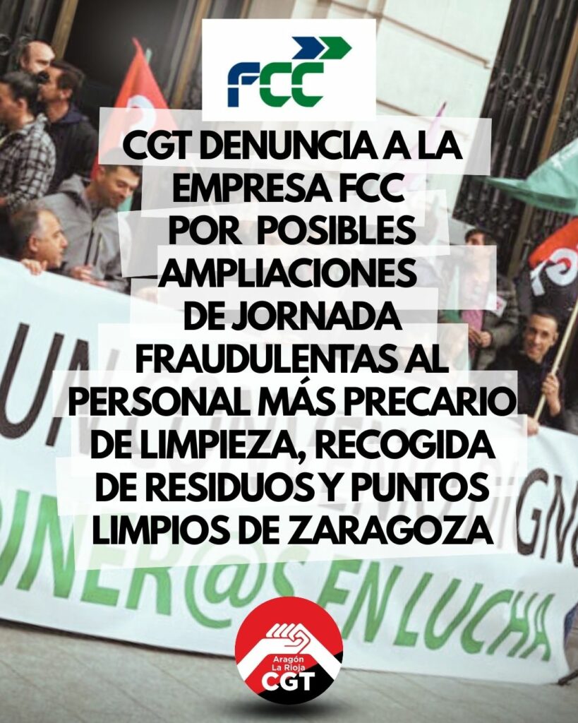 El sindicato CGT ha interpuesto una denuncia en inspección de trabajo señalando que la empresa FCC pudiera estar realizando ampliaciones de contrato fraudulentas a las y los trabajadores con contrato parcial del servicio de limpieza, recogida y puntos limpios de Zaragoza.